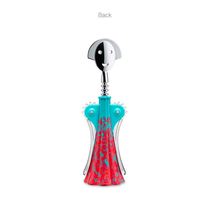 Tire-bouchon Anna G. - Liquid de Alessi par Alessandro Mendini. Le trio créatif de Studio Temp a puisé dans le profond réservoir du street art pour créer une interprétation contemporaine et cryptique des deux tire-bouchons emblématiques d’Alessandro Mendini. Les graphismes présentés sont le reflet d’une empreinte personnelle pleine d’idées éclectiques, allant des panneaux de signalisation aux techniques modernes de protection des données. La décoration contient des éléments phosphorescents qui ne sont visible que dans l’obscurité. Corps en AlkiPaper, un biocomposite breveté à base de papier, d’autres matières premières d’origine naturelle et de composants fonctionnels.
