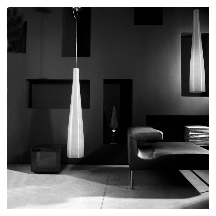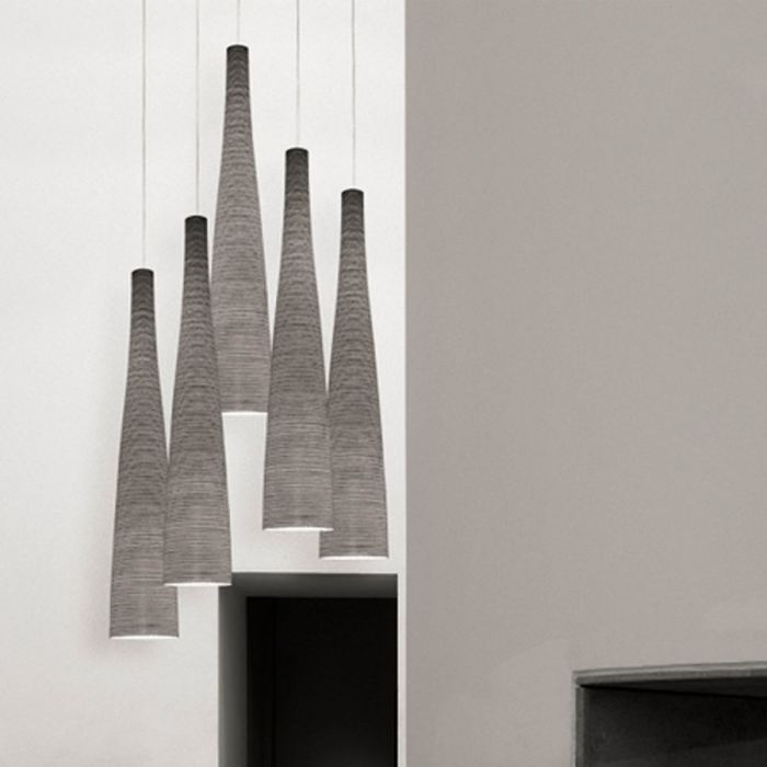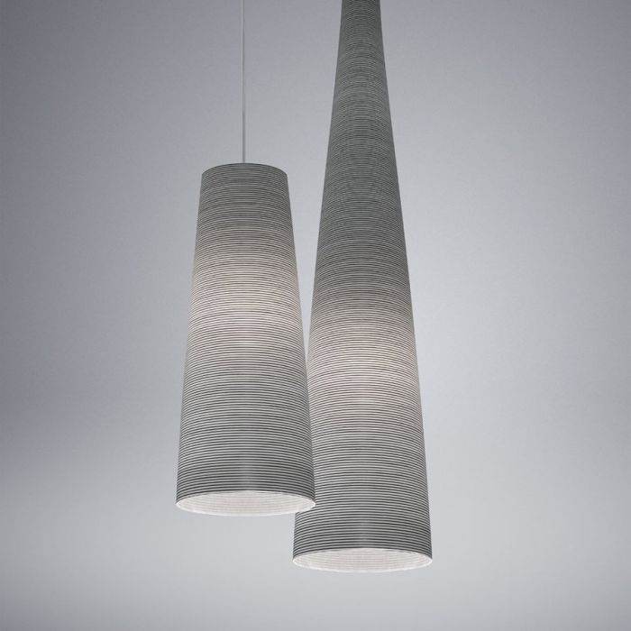 Tite est une suspension dont la ligne soulignée par la légèreté de l'abat-jour : il est en tissu de verre, veiné de fil de carbone noir. La rosace est en acier inox. Vous disposez de 2 mètres de câble et filins pour régler la hauteur à votre convenance.