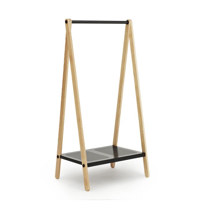 Réalisé en frêne, Toj reprend la forme du chevalet classique, sous lequel est venu s'insérer une étagère en métal, ultra pratique pour déposer vêtements et chaussures ! Avec ses lignes nettes et naturelles, son design est simple et graphique et son style chaleureux. Un portant qui peut se placer dans un dressing ou comme porte-manteau dans une entrée. Le portant Toj se décline en deux tailles différentes, en bois de frêne avec étagères blanches ou grises.