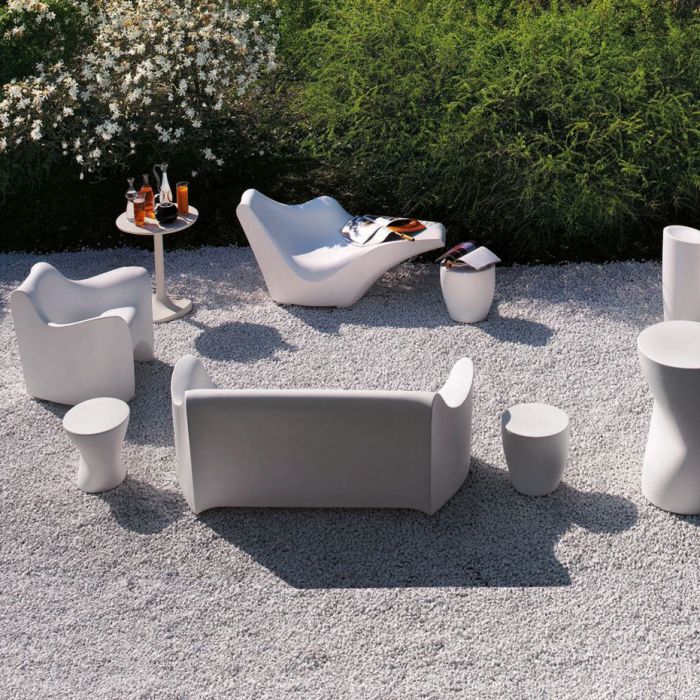 Le canapé, le fauteuil et surtout la chaise longue et le tabouret font oublier la banalité du plastique rotatif pour se transformer en véritables sculptures avec des formes inoubliables et inhabituelles.