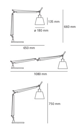 Tolomeo basculante est une lampe de bureau dessinée par Michele de Lucchi pour Artemide. Cette lampe est composée de deux bras flexibles en aluminium. L'abat-jour est à bascule, il se place verticalement indépendamment de la position du bras.