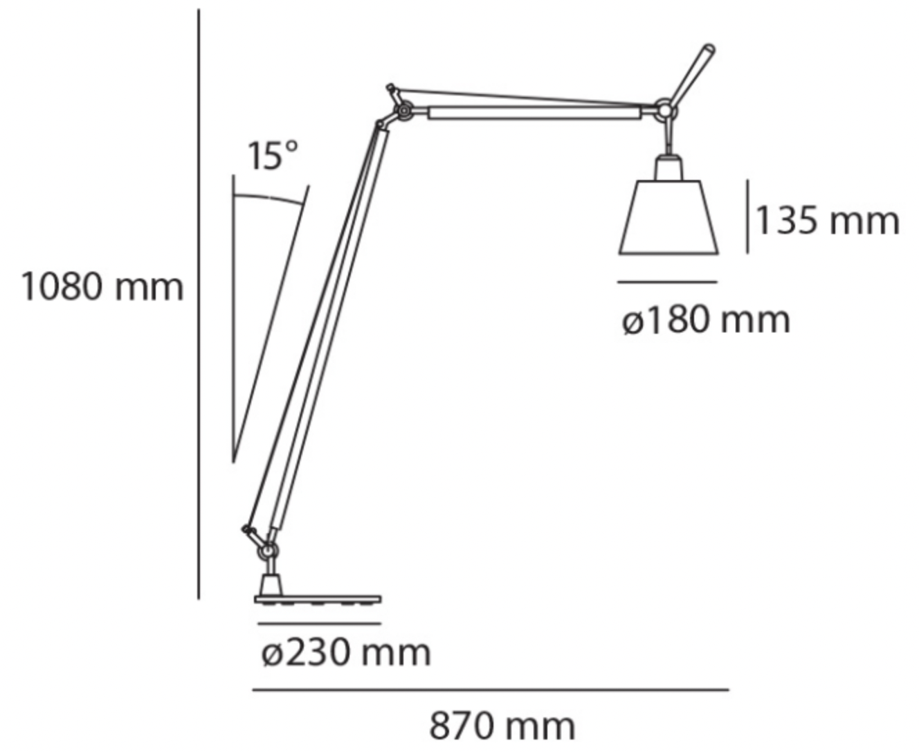 Structure : Bras articulés en aluminium poli, système d'équilibrage à ressorts, diffuseur orientable
