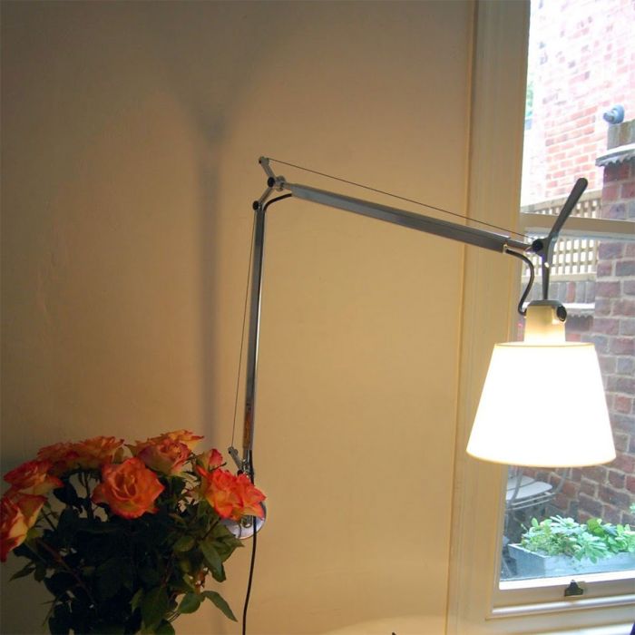 L'applique Tolomeo Basculante de Artemide est dotée d'une structure faite de bras articulés en aluminium poli. Les articulations sont en aluminium brillant, le diffuseur est en papier parchemin. La Tolomeo Basculante a un système d’équilibrage à ressorts, son émission lumineuse est directe et diffuse. Le diffuseur dans le cadre d’une utilisation normale, se place verticalement, indépendamment de la position du bras.