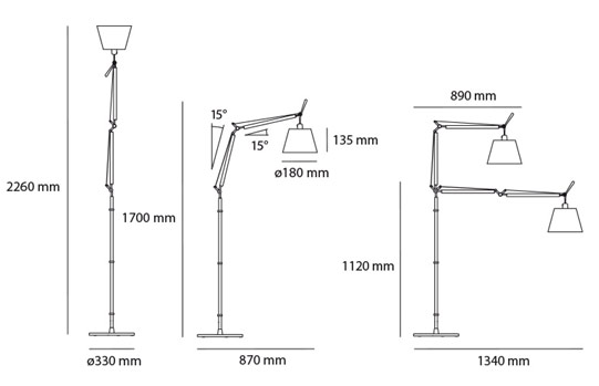 Ce lampadaire peut être coordonné avec la lampe de table, l’applique ou encore la suspension. La base du lampadaire Tolomeo peut être équipée avec un jeu de roulettes, sur demande. Le Tolomeo Mega terra constitue un instrument pour l’éclairage avec un grand diffuseur qui intègre les flux de lumière directe et indirecte. Conçu pour toutes les situations où il est nécessaire d'avoir un éclairage du haut sans affronter les travaux d'installation d'une lampe à suspension: centre de la table à manger, lecture dans le salon ou au-dessus du bureau, sur les postes de travail.