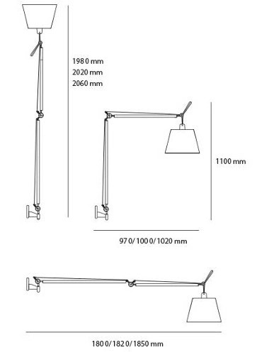 L'applique Tolomeo Mega est dotée d'une structure faite de bras articulés en aluminium poli, son diffuseur est orientable dans toutes les directions, en papier parchemin ou en polycarbonate recouvert de satin de soie, disponible en trois tailles. Ses articulations et ses supports sont en aluminium brillant. Cette applique comporte un système d'équilibrage à ressorts. L'étau est en aluminium brillant. Son émission lumineuse directe est orientable.