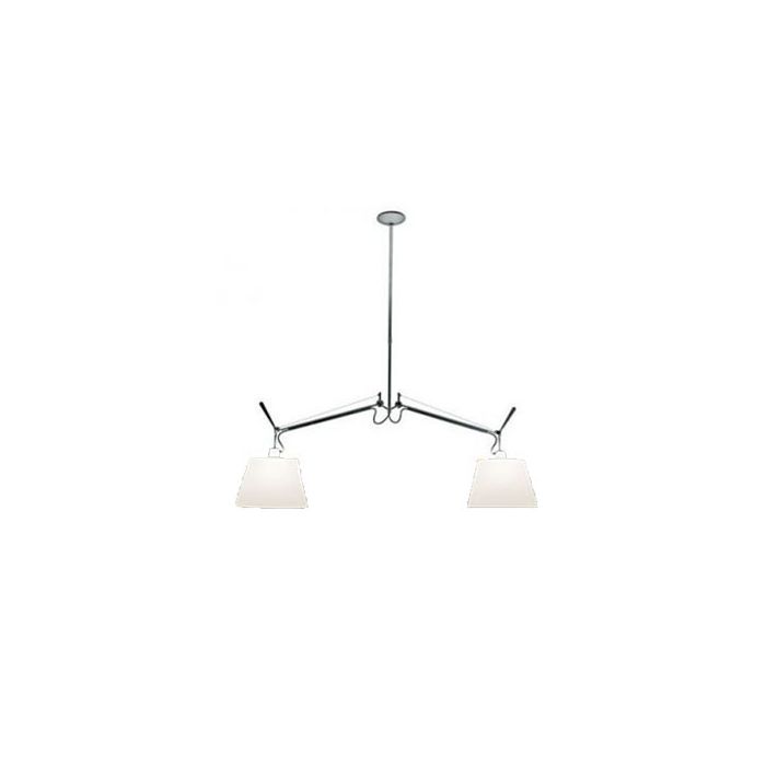 Tolomeo suspension 2 bras est une suspension composée de deux bras orientables en aluminium poli et deux diffuseurs orientables. Les diffuseurs sont en papier parchemin ou en polycarbonate recouvert de satin de soie. Le système d'équilibrage est géré grâce à des ressorts.