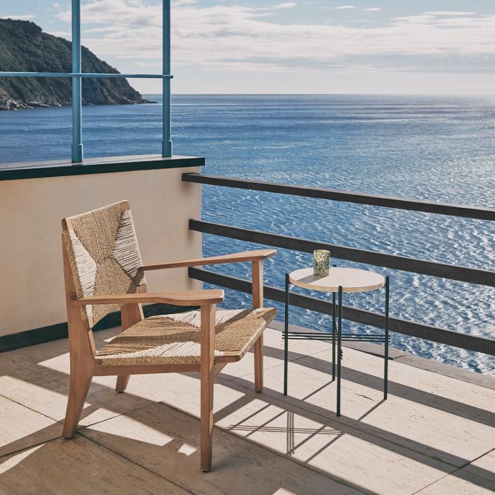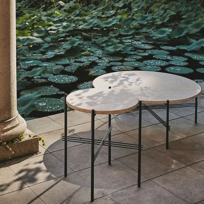 Ts Outdoor Side Table de Gubi. La collection TS est déjà bien connue et appréciée des amateurs de design pour sa capacité à s'adapter à tous les intérieurs et toutes les ambiances. Maintenant, les tables d'appoint et basses TS à base noire reçoivent le traitement extérieur. Les plateaux de table luxueux, en travertin blanc magnifiquement veiné, complètent les bases géométriques pointues en acier inoxydable enduit de poudre et permettent à l'esthétique intérieure élégante de la collection de franchir le seuil à l'air libre.