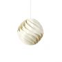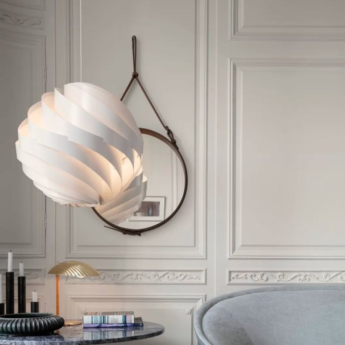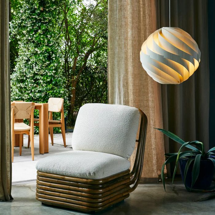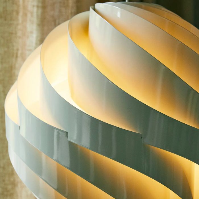 Turbo de Gubi par Louis Weisdorf. La suspension Turbo de Louis Weisdorf a été conçue en 1965, mais mise en production pour la première fois en 1967 et a connu un grand succès au fil des années. Il illustre le design à son meilleur : il est simple dans sa forme, mais complexe dans sa structure et combine une sensation de légèreté et de force dans un bel ensemble sculptural. L'inspiration pour la lampe est la légèreté du papier de riz japonais transformé en une version plus durable et robuste. La courbe extérieure de la lampe est constituée de douze lamelles en spirale similaires, qui forment un globe en forme de fleur qui protège la lumière. Le Turbo Pendant est un parfait exemple de la passion de Weisdorf pour les multiples éléments répétitifs qu'il a.