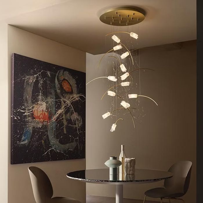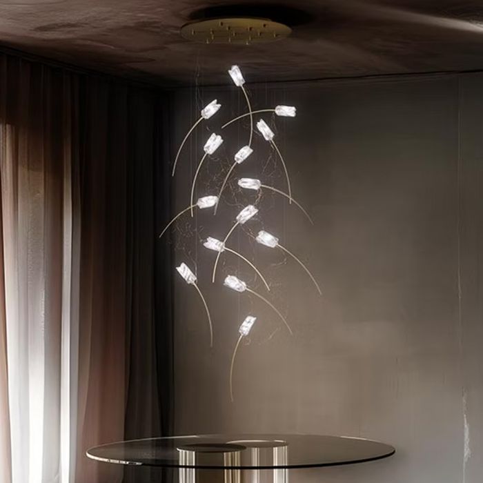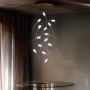Imaginatives, élégantes, légères. Tulipe orne littéralement des espaces avec des fleurs flottantes moulées à la main selon les méthodes de Slamp, si bien que chaque espace est unique. Les câbles presque invisibles maintiennent les fleurs suspendues qui fleurissent à partir de tiges en laiton brossé ; chacun est prépositionné à des angles spécifiques pour créer une sensation de morphologie naturelle. Chaque tulipe est connectée à la suivante par une série de fils de cuivre tissés de manière complexe conduisant l'électricité basse tension. La collection comprend des configurations plug & play de 7 ou 14 fleurs en cascade à partir d'une seule rosace de plafond rectangulaire ou ronde en laiton brossé, ou des faisceaux autonomes de 14 fleurs qui peuvent être installées selon les goûts personnels et l'espace disponible. Les sources lumineuses LED sont incluses et peuvent être remplacées de manière autonome.