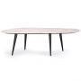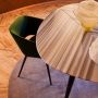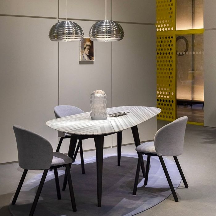 La table tweed marble a un plateau en marbre Striato Olimpico, épaisseur 20 mm, avec vernis de protection antitache en polyester transparent mat. Sous-plateau en MDF épaisseur 40 mm laqué noir mat. Pieds en tube d'acier peint en noir mat. Un cadre renforcé avec des pieds en acier tubulaire conique et un piètement en MDF supporte les deux dalles de marbre striées qui ont été placées spécifiquement pour assurer que les veines s'alignent pour former un motif en losange dans un jeu spéculaire très précis et à fort impact qui fait ressortir les propriétés du matériel. Les formes lisses sont fonctionnelles pour faciliter l'interaction et la communication autour de la table et les deux conceptions de table irrégulières sont conçues pour accueillir plusieurs convives et répondre à diverses exigences d'espace.