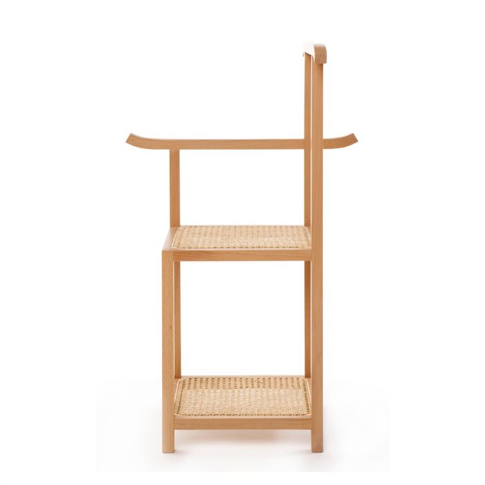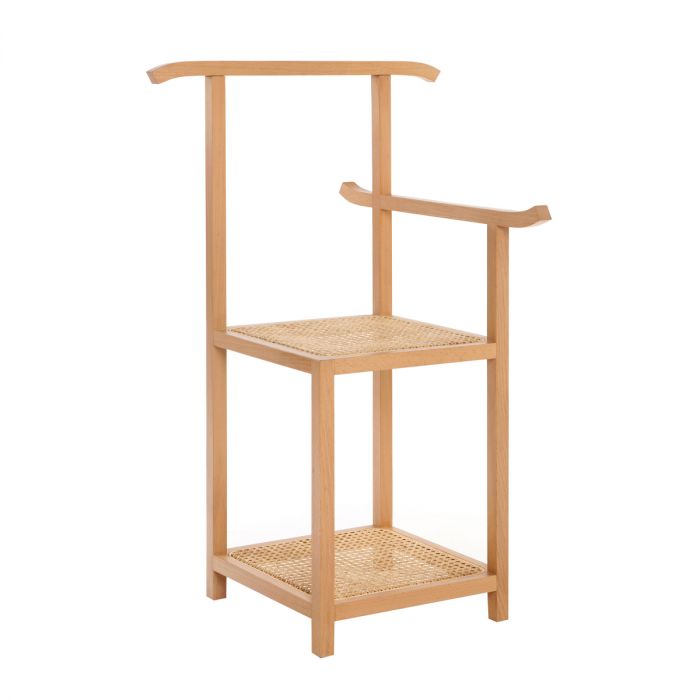 Designer originaire de Singapour, Nathan Yong signe une pièce au style minimaliste, avec des références orientales. Fonctionnel, ce meuble 2-en-1 fait office de valet et de chaise : pratique pour s’asseoir afin d’enfiler ses chaussures ! L’étagère située sous l’assise permet de ranger vos sacs et souliers. Le dossier et l’accoudoir servent de cintres pour suspendre vos vêtements ou serviettes. Majordome trouve sa place dans une chambre ou une salle de bains. Majordomo se compose d’une structure en frêne hêtre massif à section carrée. L’assise et l’étagère sont en cannage de paille naturelle.