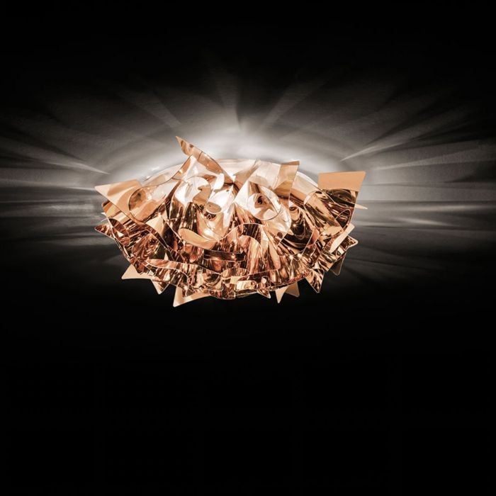 Qualité et brillance sont les valeurs que les collections Veli Silver et Copper, ajoutent à chaque intérieur grâce à Goldflex®, Steelflex® et Copperflex®, les polymères métallisés brevetés par Slamp. S’inspirant à la douceur des tissus, le designer Adriano Rachele a transposé le concept sur la collection (3 plafonniers/appliques et 2 suspensions – tous avec une fixation magnétique) en projetant un système de montage qui est effectué à la main à travers des encastrements et sans aucun point de jonction à vue.