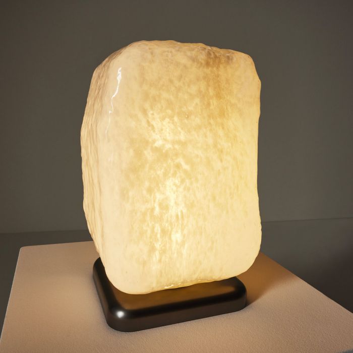 Wax de Cassina par Linde Freya Tangelder. Wax, Stone, Light de Linde Freya Tangelder développe l'idée originale de blocs sculpturaux empilés de façon précaire pour former une colonne architecturale apparemment instable. Intriguée par les matériaux liquides qui changent de forme pour devenir solides, la designer a commencé à expérimenter le verre pour découvrir les multiples facettes de ce matériau, en jouant avec les transparences, les sensations tactiles et la lumière afin de créer non seulement un objet, mais aussi une atmosphère. La collection se compose de cinq colonnes totémiques de différentes tailles, réalisées avec des cubes de verre de Murano soufflés par des artisans à l'intérieur de moules en fonte. Les éléments, empilés verticalement les uns sur les autres, sont reliés au centre par un tube LED qui éclaire l'ensemble de l'œuvre d'une lumière chaude.