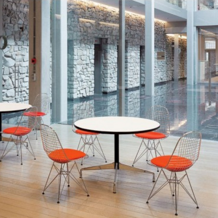 Avec la chaise Wire DKR-5 (1951), les Eames déclinent le thème de la coque d’un seul tenant aux lignes organiques en alliant transparence et légèreté à une haute technicité. Le modèle DKR-5 est avec coussin d'assise.