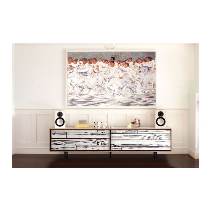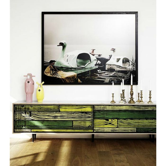 Le mobilier ''WrongWoods'' a été dessiné par le designer Sebastian Wrong et décoré par l'artiste Richard Woods dans le cadre de son projet ''Collaborations'', Established & Sons. Un duo explosif qui réinterprète de façon audacieuse et ultra originale le mobilier moderniste d'après-guerre. Ces meubles en contreplaqué sont habillés d'un imprimé façon cartoon imitant des planches de bois coloré. Ces motifs aux coloris vifs sont à la fois classiques et dissonants. Le résultat, volontairement osé et tape-à-l'oeil est une façon pour Richard Woods de ridiculiser le faux bon goût des intérieurs bourgeois. Un style british survitaminé, plein de fantaisie qui amuse par son ironie.