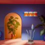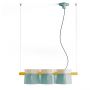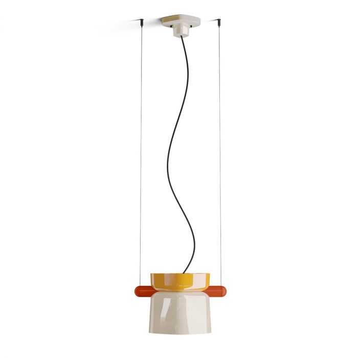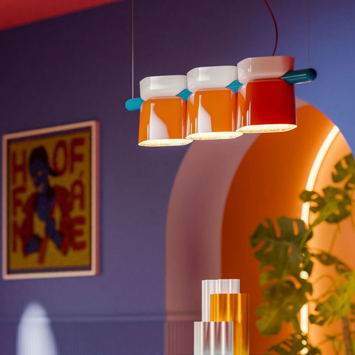 Yakitori de Ferroluce. Avec ses multiples éléments suspendus dans dans les airs qui semblent presque embrochés sur un gros bâton, Yakitori évoque l'ambiance joyeuse et épicurienne des stands de nourriture de rue environnants, avec ses couleurs folkloriques et la clientèle animée. Les éléments en céramique, conçu dans diverses combinaisons de couleurs, sont attachés à un support de couleur contrastée. La barre latéral, fournissant la structure nécessaire et la flexibilité réelle pour éclairer la surface d’un comptoir, un bureau, une table à manger ou même les couloirs de n'importe quel espace.
