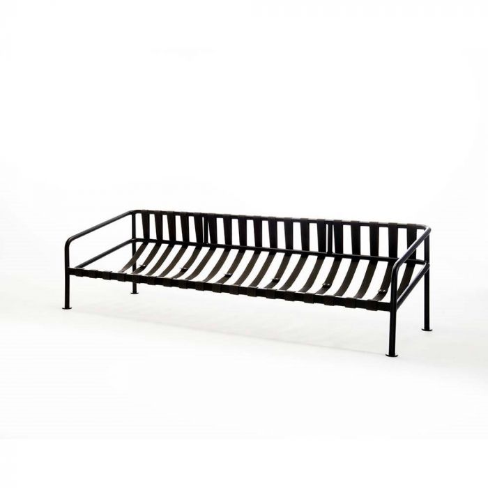 Cadre de transport en acier RAL 3004 noir mat ou rouge, avec des sangles rigides en polyester dans la teinte anthracite pour le soutien des coussins.